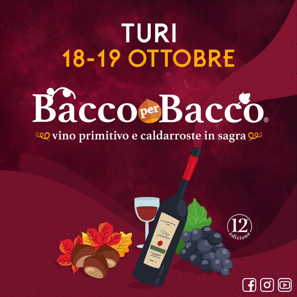 Ottobre è il mese delle sagre in Puglia, e non c’è niente di meglio per immergersi nella cultura locale. Tra le più celebri ci sono la Sagra Bacco per Bacco a Turi, il 18 e 19 Ottobre 2025, a 12 km dal B&B Beby in Viaggio. Ma anche sagre sui funghi, castagne ecc che riporterò qui appena pubblicheranno aggiornamenti su eventi e date.